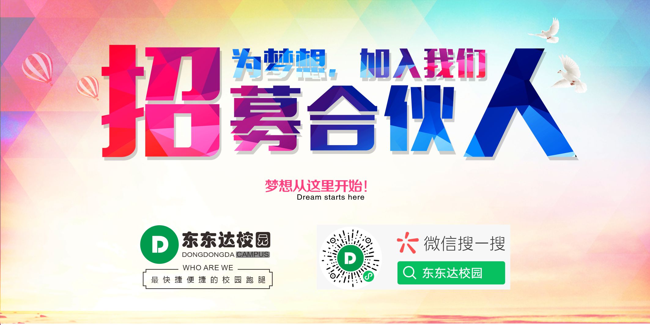 无需投入资金,零加盟费,总部进行一站式扶持,将各种方法量化到书面,并做技术支撑,只需要有责任心,上进心,执行力强即可成为校园合伙人,可以手机扫描下方小程序二维码或微信搜索东东达校园。